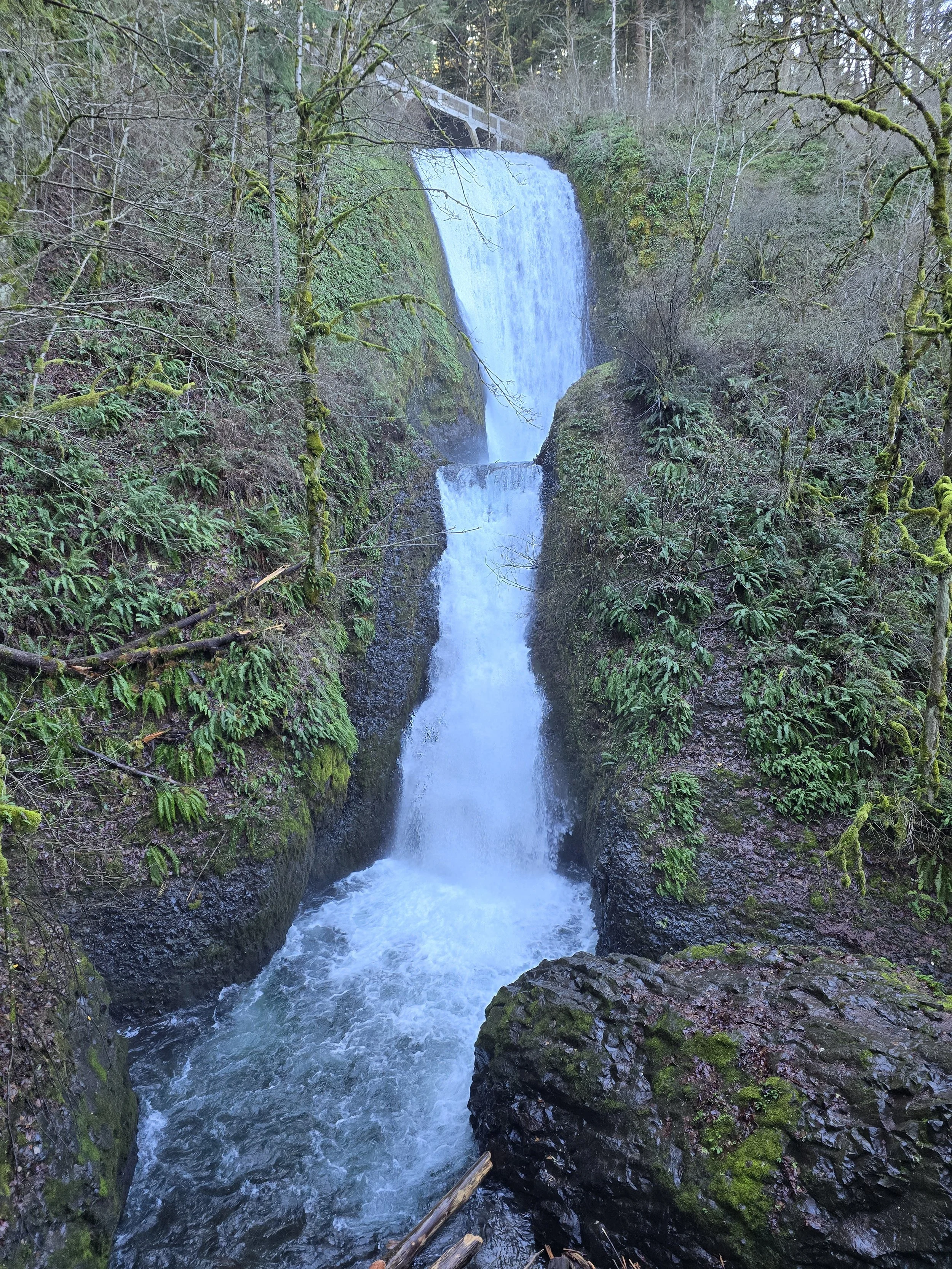 Bridal Veil Falls State Scenic Area: Not far from Latourell Falls, Bridal Veil Falls is another beautiful waterfall in the Columbia River Gorge. The hike to the falls is short with a slight downhill to the creek and falls, which means a bit of an uphill to get back to your car. Perfect for beginners and for any ages. Start your journey to the falls from the Bridal Veil State Park. Parking is ample for the tourists. After few feet of steep but pleasant steps on a winding footpath, I was standing on the edge of Bridal Veil Creek. Bridal Veil Falls is a beautiful waterfall that seems almost otherworldly in its beauty. As it tumbles gracefully down a two-tiered drop, the falls resemble a delicate, flowing veil—hence the enchanting name.
